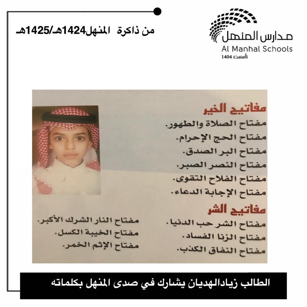 الطالب: أبَي عصام ميرغني حاصل على شهادة التفوق من إدارة تعليم منطقة الرياض،،، يحكي لأصدقائه أسباب التفوق،،، خلدت كلماته لأسرة المنهل حتى اليوم