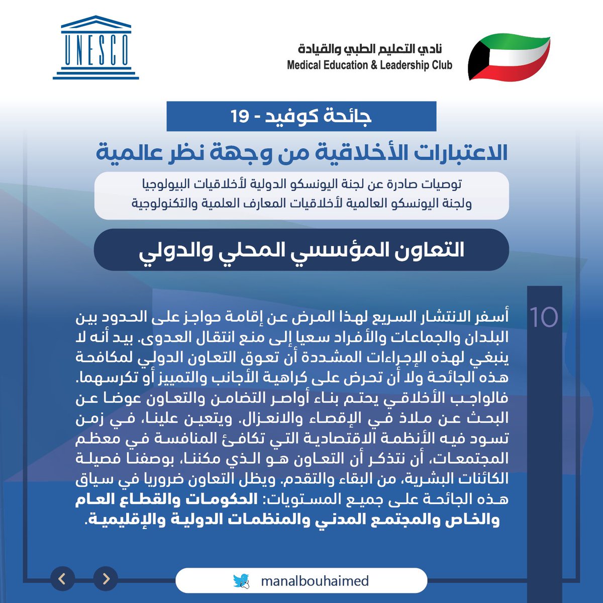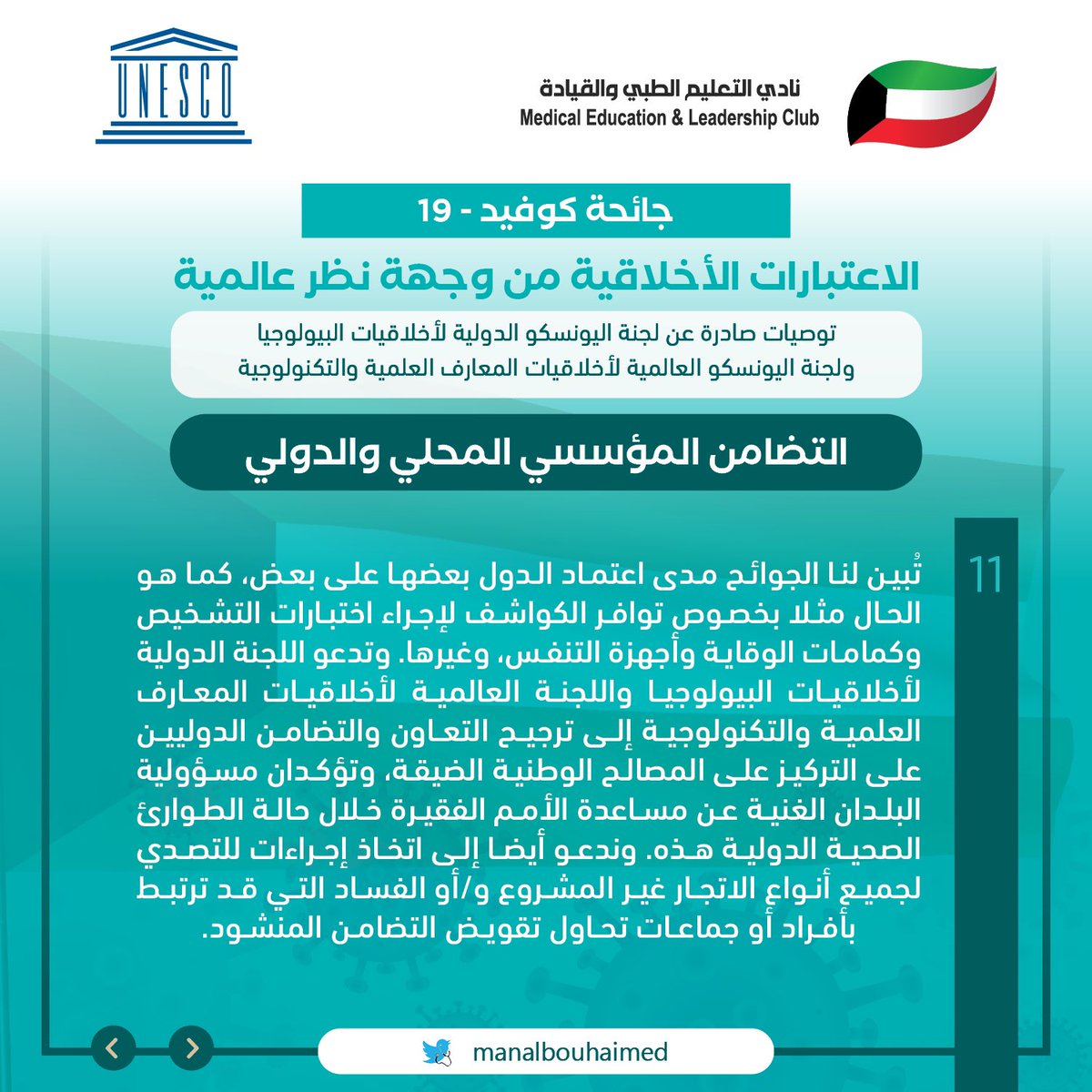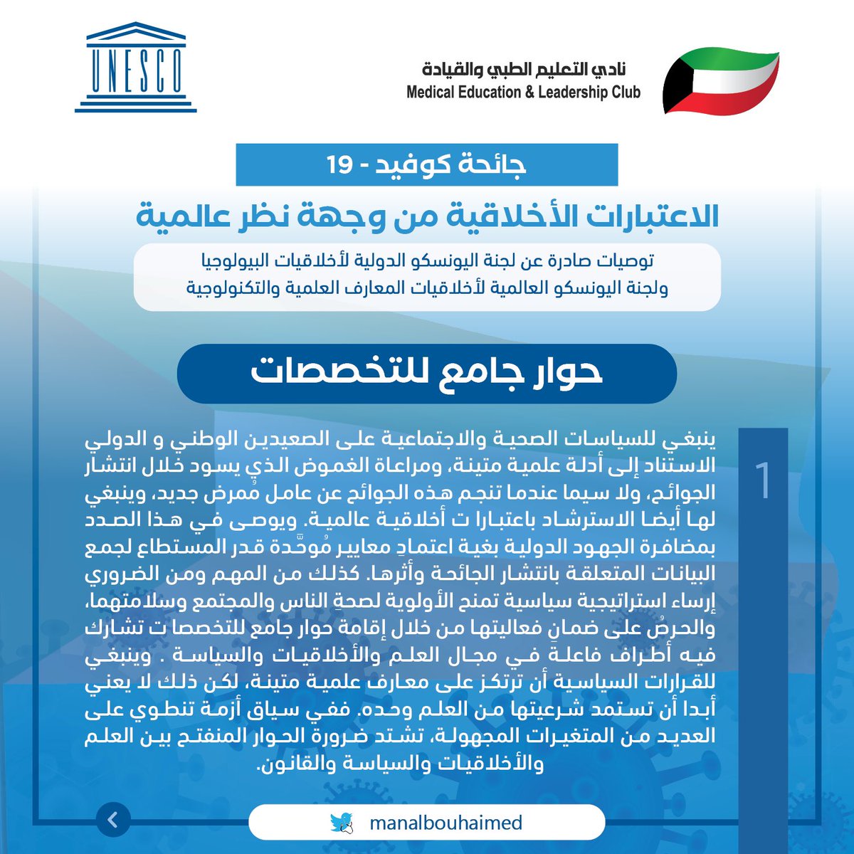 " من خبرتي باليونسكو" مجموعة من التغريدات حول البيان الصادر عن اللجنة الدولية لأخلاقيات البيولوجيا واللجنة العالمية لأخلاقيات المعارف العلمية والتكنولوجية باليونسكو بشأن الإعتبارات الأخلاقية العالمية للتعامل مع جائحة كوفيد -19