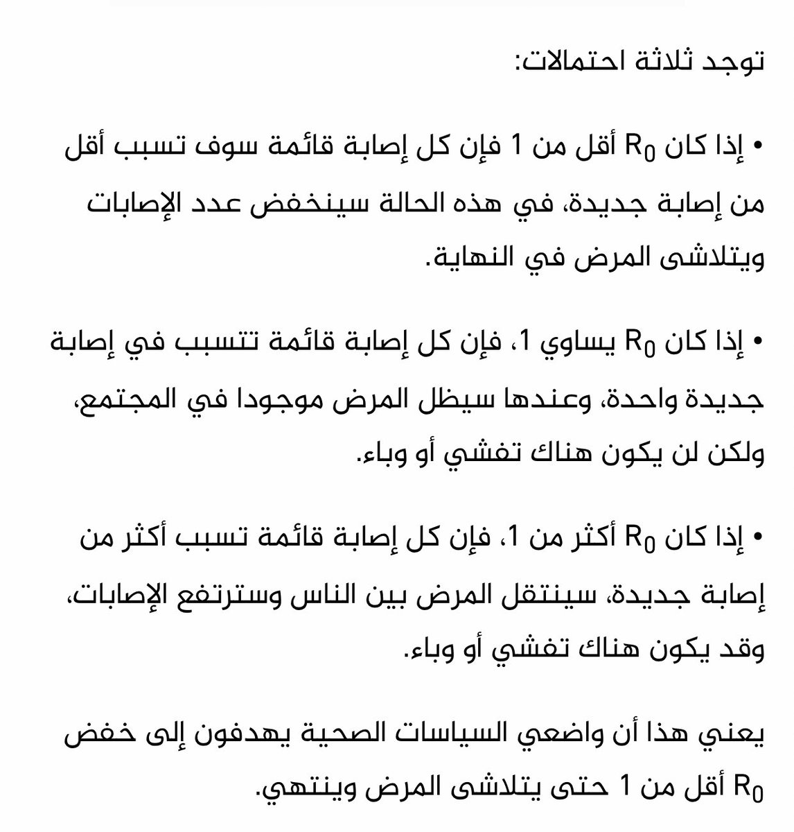 المشكلة تحصل لمن يكون معامل الانتشار R اكبر من رقم واحد، كلما زادت عن الواحد كل ما كانت خطورة الاننشار اكبر،،، لذلك الهدف هو خفض هذا الرقم في حالة الكورونا من ٣ الى اقل من واحد حتى يتم احتواء الفايروس...وهذا هو هدف التدابير من حظر وعزل وايقاف للطيرانات..