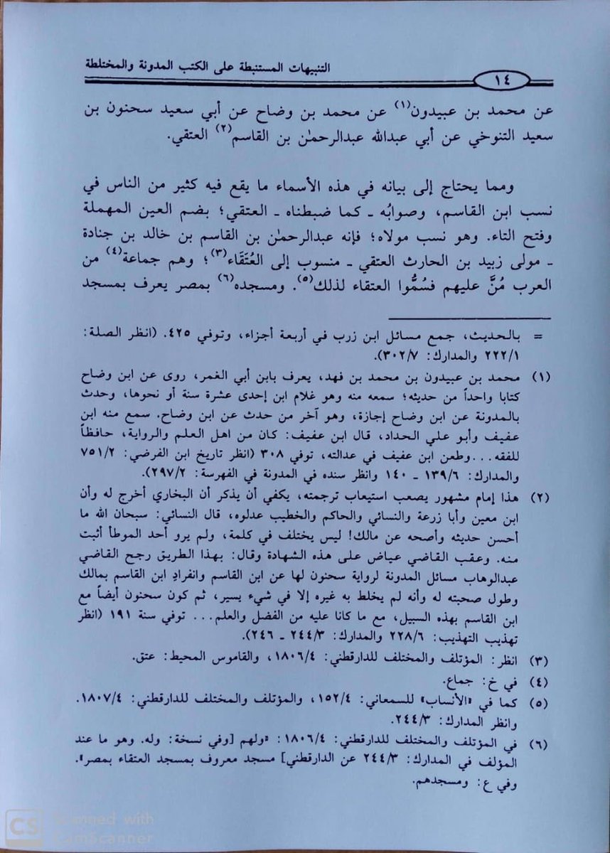 33-قال : نا أبو علي الحسن بن أيوب الحداد ؛ عن محمد بن عبيدون ؛ عن محمد بن وضاح ؛ عن أبي سعيد سحنون _ بفتح السين _ بن سعيد التنوخي ؛ عن أبي عبدالله عبدالرحمن بن القاسم العتقي _ بضم العين المهملة وفتح التاء _ " .