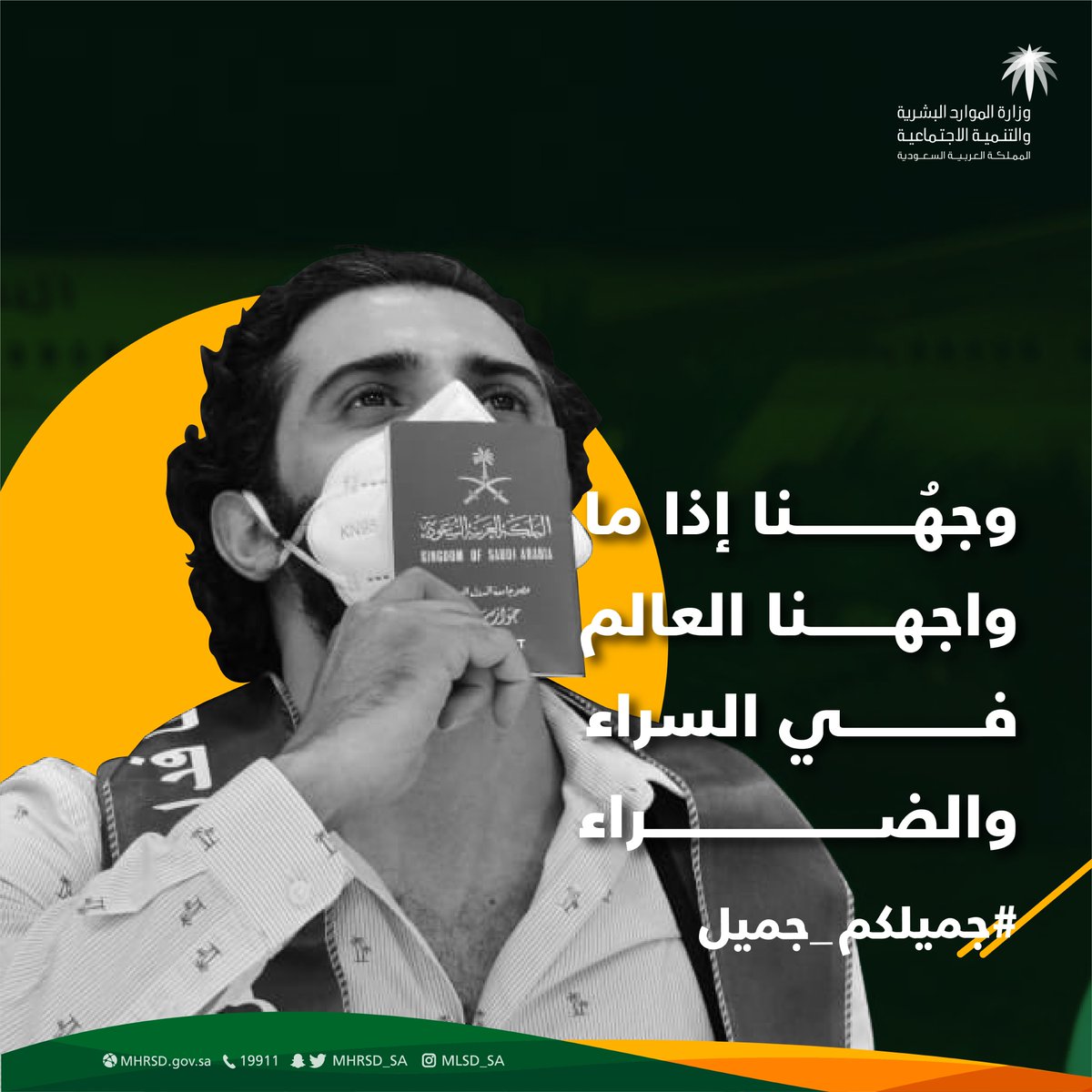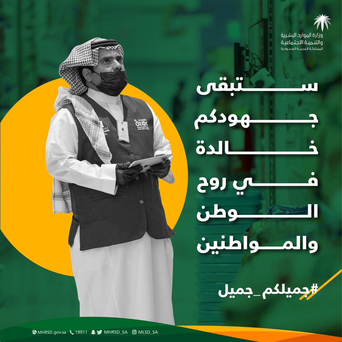 امتنان وشكر لموظفي وزارة الموارد البشرية والتنمية الاجتماعية، منبع مواردنا البشرية، وقادة التنمية الوطنية؛ على ما أظهروه من جهد وعمل دؤوب في مواجهة جائحة فيروس كورونا #جميلكم_جميل