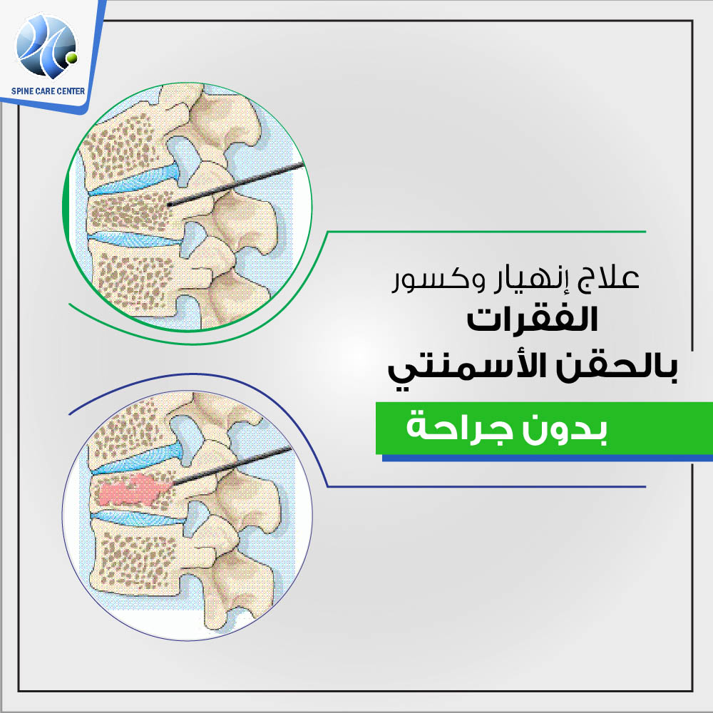 2-الحقن الأسمنتى:يشترط أن لا يكون الكسر مسبب ضغط على الحبل الشوكي أوالأعصاب المركزية حيث يتم عمل حقن للفقرة بمادة إسمنتية داخل جسم الفقرة عن طريق إدخال إبرة الحقن الأسمنتى داخل الفقرة المصابةوفى بعض الحالات يتم إدخال بالون داخل جسم الفقرة ويتم نفخ هذا البالون لإستعادة بناء الفقرة