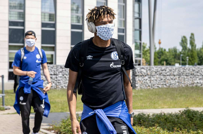 جان كلير توديبو لاعب برشلونة المعار لشالكه في طريقه لداخل ملعب سيجنال إيدونا بارك استعدادًا لمواجهة بوروسيا دورتموند، ويبتعد عن أقرب زملائه بمسافة كافية😷