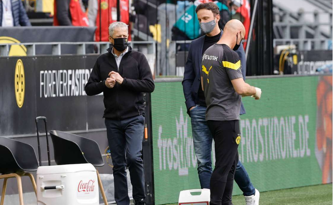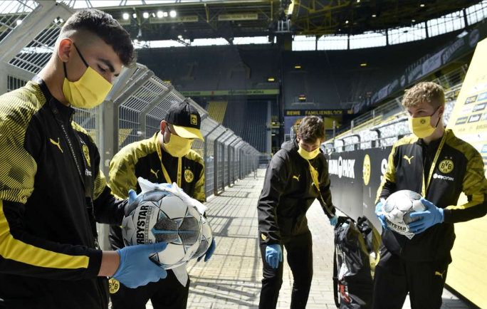 دورتموند ضد شالكه الطاقم الفني لبوروسيا دورتموند على الخط بالكمامات الطبية والكراسي متباعدة🦠