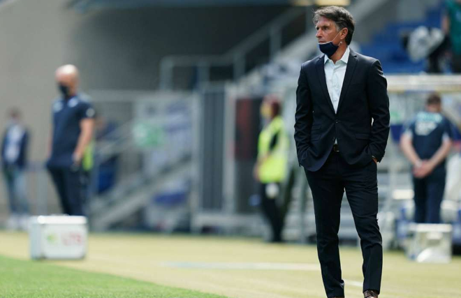 برونو لاباديا المدير الفني لفريق هيرتا برلين بعيدًا عن نظيره الفريد شرودر مدرب هوفنهايم.