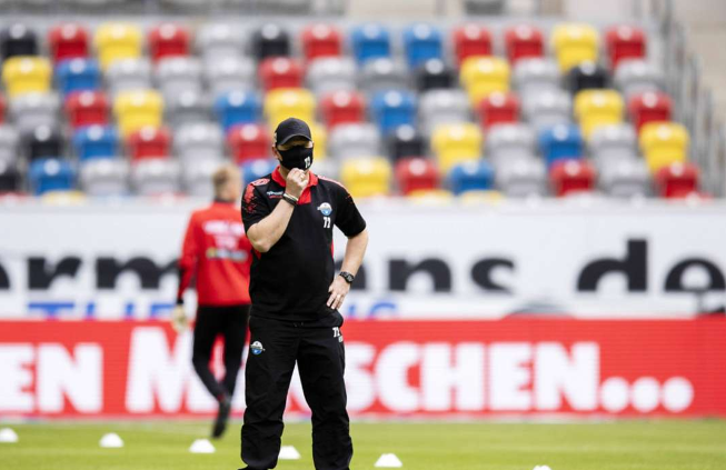 حركات الإحماء قبل مباراة دوسلدورف ضد بادربورن حاضرة أيضًا لكن بمسافات كبيرة بين اللاعبين والأطقم الفنية.