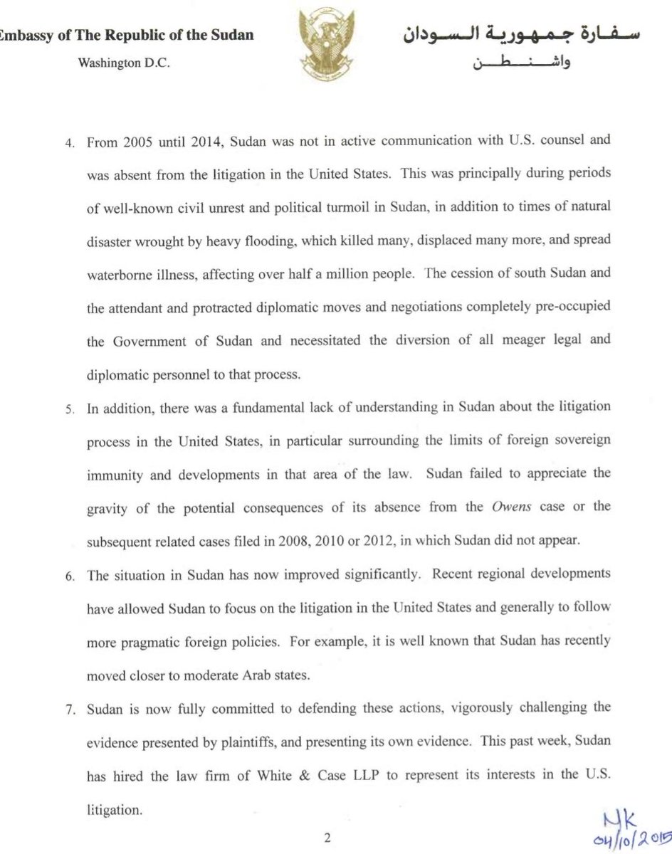 -....في المحاكم الأمريكية والكوارث الطبيعية التي سببتها الفيضانات والأمراض مثل الكوليرا والإسهال المائي وانفصال جنوب السودان مما تطلب تسخير موارد الدولة السودانية بعيدا عن هذه القضايا في المحاكم الأمريكية وان الآن (في 2015) السودان في وضع يمكنه من الدفاع عن نفسه بعد ان اقترب...