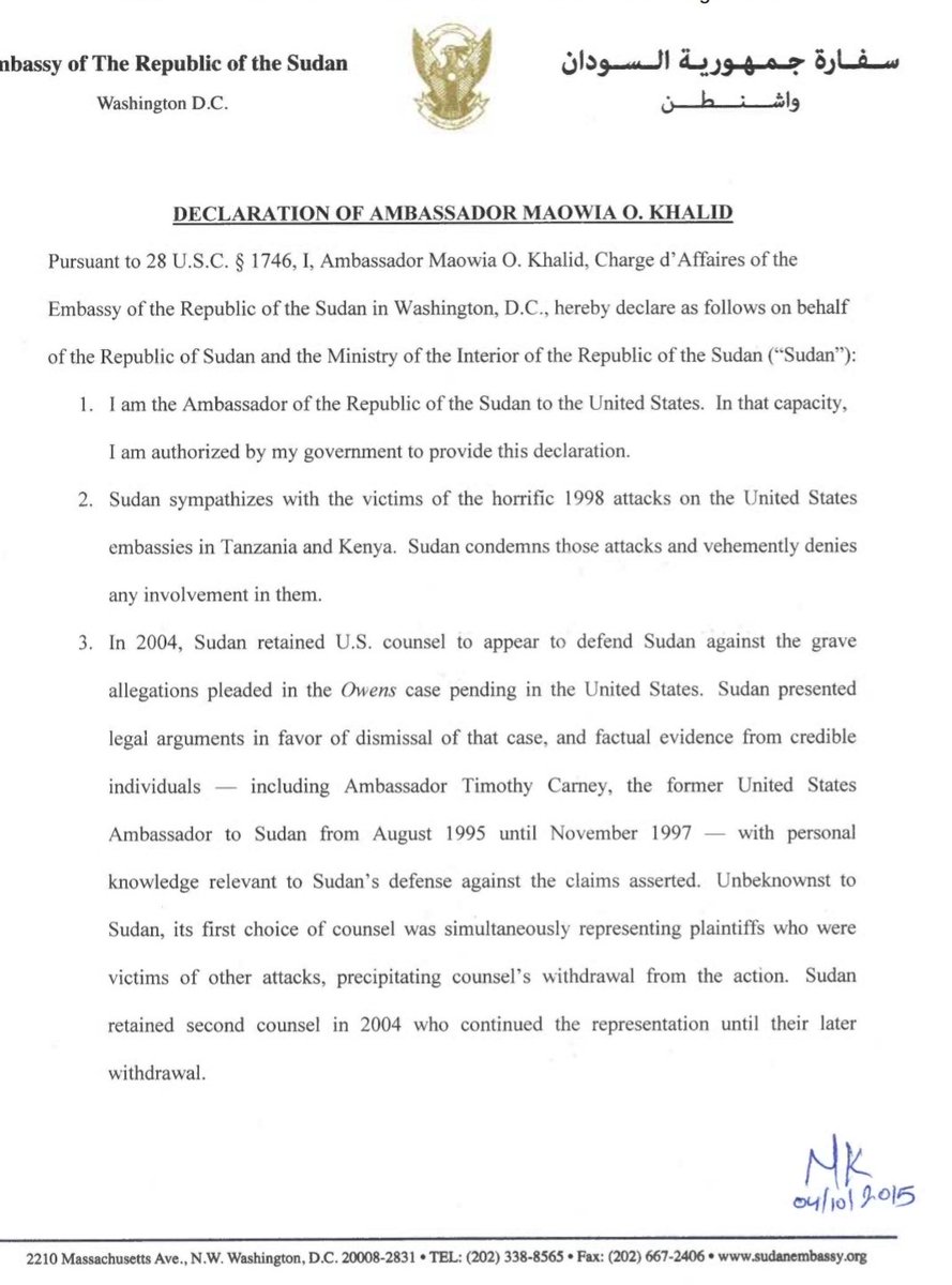 - قضية السفارات بدأت عام 2001 ضد حكومة جمهورية السودان و حكومة الجمهورية الإسلامية الإيرانية
