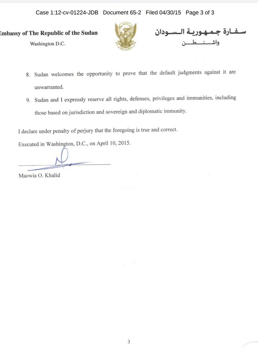 - في يوليو 2017 ثبتت المحاكم الحكم ضد السودان ولكنها اسقطت ال punitive damages بقيمة 4.3 مليار دولار وأبقت ال 6 مليار بحجة أن القانون لا يسري باثر رجعي.