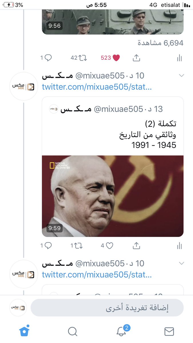 يوم انزل وثائقي في عدة تغريدات كثيرين يسألون ليش ما تنزله ثريد ، انا احط المقطع الاول و اقتبس التغريدات الثانية واحطها كسلسلة مثل ماهو موضح بالصورة ، اما انزلها مباشرة تحت التغريدة مقدر لأني اغرد بالمقاطع من استوديو تويتر في سفاري مش من تطبيق تويتر ، فالافضل بس تفضلون اول تغريدة