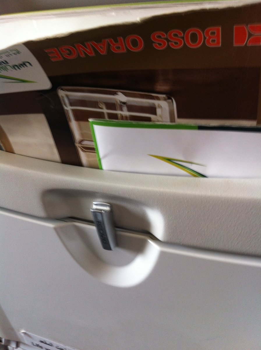 في نفس #الطائرة بعض طاولات المقاعد يمكن فتحها بتحريك القفل لليمين و لليسار وبعضها لا يمكن فتحها إلا بتحريك القفل لليسار وبعضها لا يمكن فتحها إلا بتحريك القفل لليمين