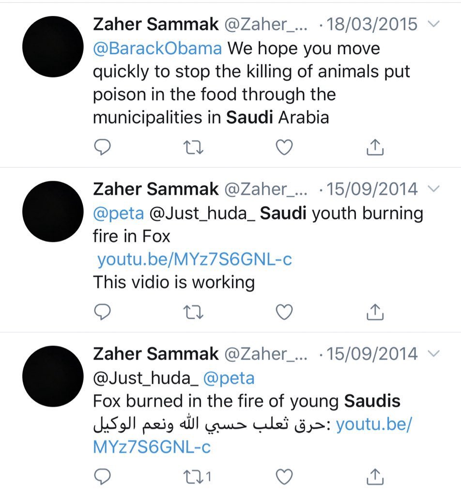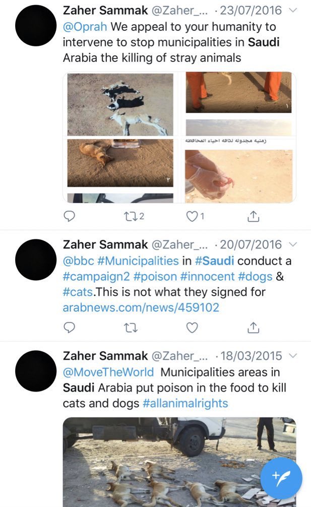 احد جوانب نشاطه الحقوقي المزيف هو التشويه المستمر منه للسعودية والمقارنة بدول اخرى للإساءة بلا حياء للبلد الذي اكرمه بحجة الرفق بالحيوان