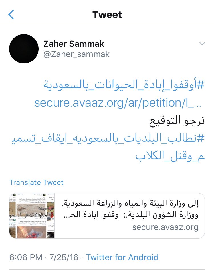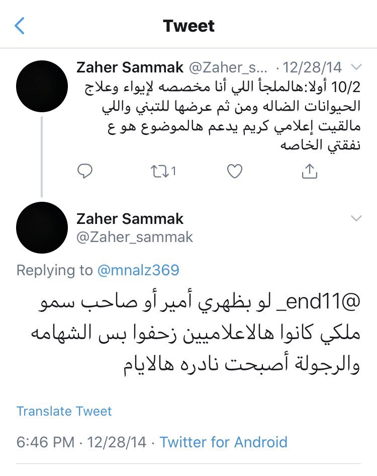 زاهر سماك مقيم فلسطيني بالرياض ظهر منذ سنوات بوسائل التواصل الاجتماعي يبحث عن دعم مادي بجمع التبرعات دون ترخيص والتحويل لحساب بنكي بإسم شخص اخر لإنشاء ملجأ حيوانات دون تصريح من وزارة البيئة وتم دعمه من جهات اعلامية بعضها محلية ومستمر بنفس النشاط بدون اشراف رسمي