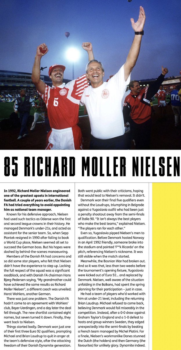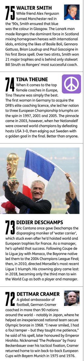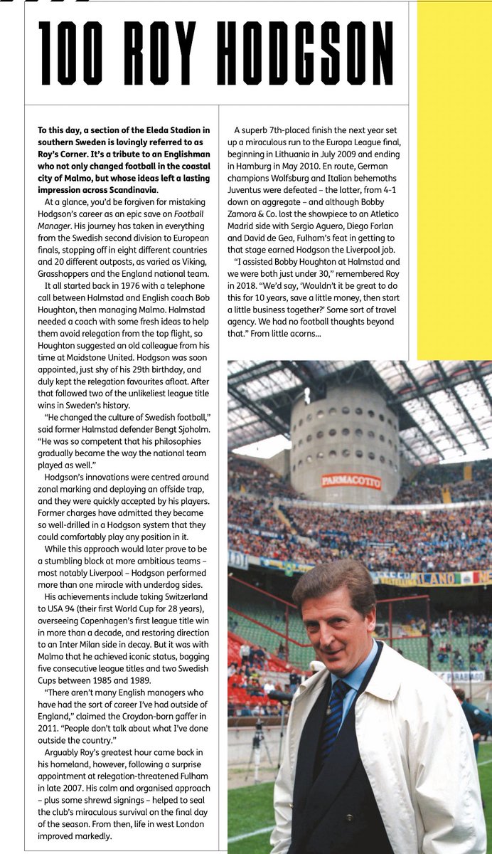 ١٠٠: روي هودسن: بدأ سنة ٧٦ ودرب ~ ٢٠ فريق ومنتخب في أماكن كثيرة (السويد - سويسرا - النرويج - فنلندا - إيطاليا - الدنمارك - إنقلترا) ومن المنتخبات (الإمارات - فنلندا - سويسرا - إنقلترا). يقول جوناثان ويلسون بأنه صاحب تأثيرٍ كبير على الكرة السويدية (دفاع المنطقة / تطبيق التسلل).