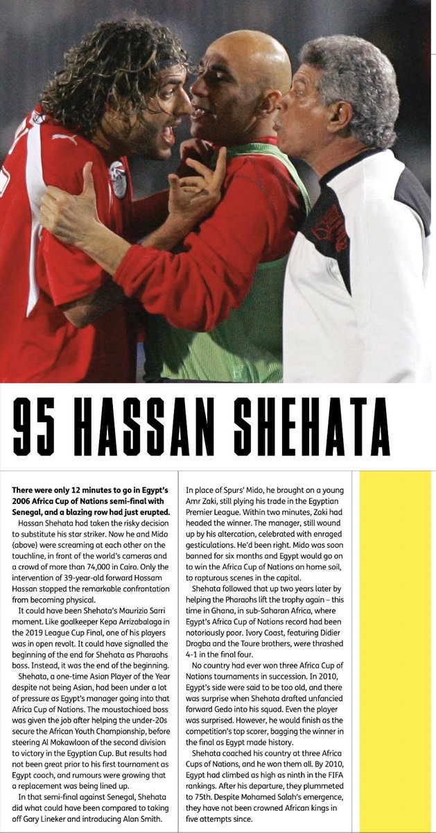 ٩٥: حسن شحاتة: أفضل لاعب بآسيا ومدرب بإفريقيا. حقق كأس مصر للمقاولون (درجة ثانية) وقاد مصر لثلاثية إفريقية (٠٦-٠٨-١٠) وهزم إيطاليا بالقارات و وصل ببلاده للمركز ٩ بالتصنيف الدولي. درب عديد النجوم منهم أبو تريكة، أحمد حسن، وائل جمعة والحضري. راهن على عمرو زكي -٠٦- وجدو -١٠- ونجح.