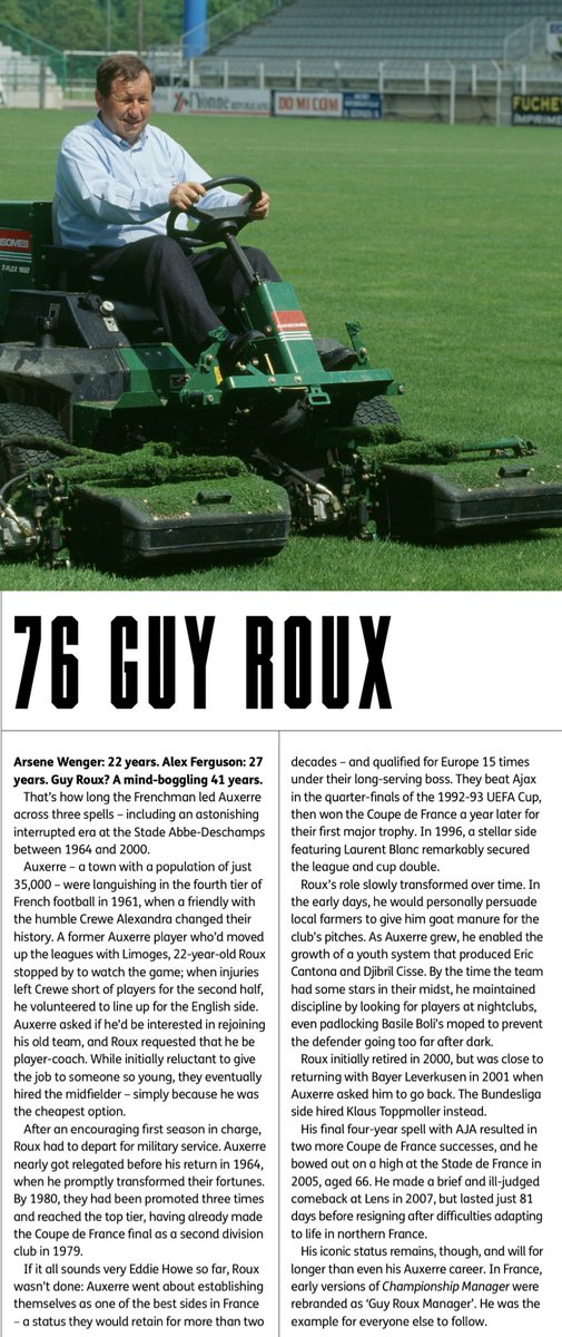 ٧٦: قاي رو: درب أوكسير أكثر من ٤٠ سنة، ولأكثر من ٢٠٠٠ مباراة، بدأ بدور مزدوج (لاعب ومدرب) في ١٩٦١ بالدرجة الرابعة، ثم اعتزل اللعب في عام ٧٠، وصعد بهم للدوري الممتاز، وفاز فيه مع الكأس موسم ٩٥-٩٦. فاز بالكأس ٤ مرات، أبرز من صعدوا خلال فترته كانتونا، ميكسيس، بلان وسيسيه.