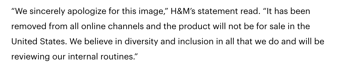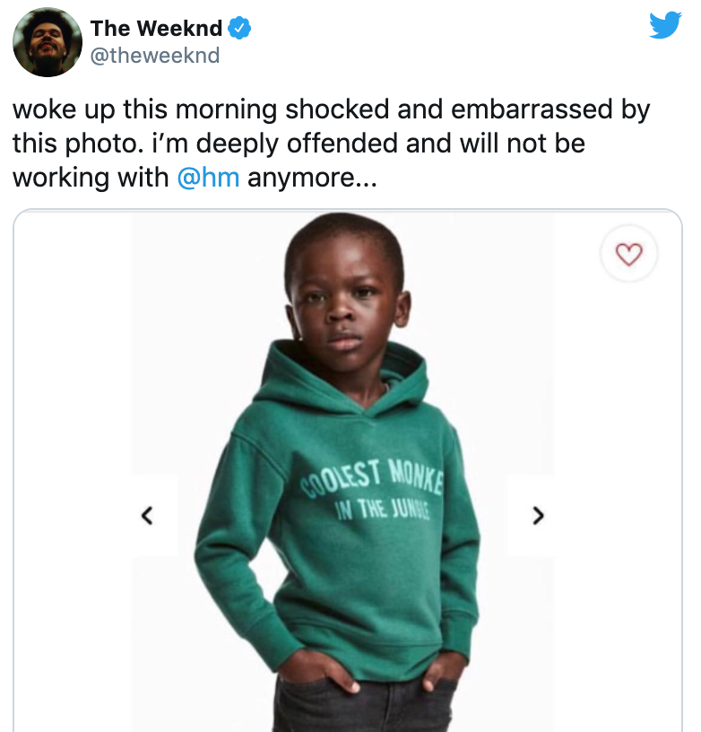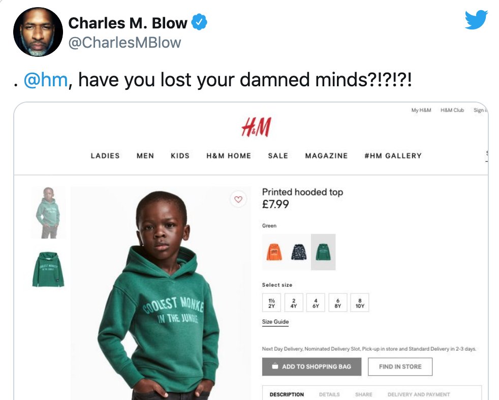 في عام ٢٠١٨ تعرضت H&M الشركة السويدة لبيع الملابس لأزمة كبيرة بعد ما تم وصفها بالشركة العنصرية .. بسبب نشرهم لصورة في موقعهم لطفل اسمر البشرة يرتدي Hoodie ومكتوب عليه " أجمل قرد بالغابة " .. واللي اصبح بعدها الطفل Liam ايقونة للحرب ضد عتصرية الشركة " مثل ما وصفوه "