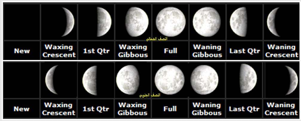 في النصف الشمالي للأرض يزداد نور #القمر على سطحه من اليمين إلى اليسار، وفي النصف الجنوبي عكسه، طالع الشكل