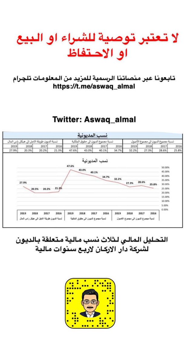 - ولنكون اكثر موضوعية يجب البحث ومقارنة شركة دار الاركان بشركات اخرى من نفس القطاع حتى تكون لدينا المقدرة في مقارنة الشركة الاقل عرضةً للفلاس.. ايضا مقارنة افضل الشركات لديها اعلى معدل ربح مقارنه بديونها.