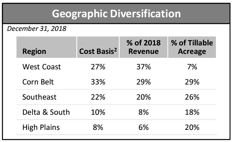 تمتلك مساحات كبيرة من الأراضي الزراعية، وتقوم بتأجيرها على الشركات الزراعية والمزارعين وتستفيد من الايجار بتوزيعه على المساهمين كعائد وبشراء أراضي إضافية، وكذلك تستفيد من ارتفاع سعر الاراضي تاريخيا مع مرور الوقت.