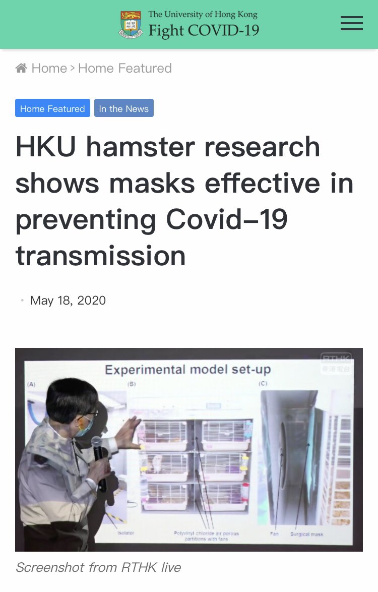 3- قام الفريق بوضع الكمامات الطبية على قفصي الفئران المصابة والفئران السليمة مع وجود تيار هوائي متحرك من قفص الفئران المصابة بإتجاه قفص الفئران السليمة. وجد الباحثون أن نسبة انتشار العدوى بين القفصين كانت أقل بنسبة 60% مع استخدام الكمامات الطبية.