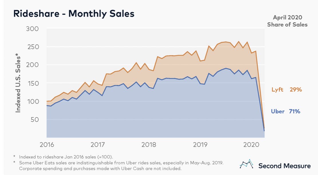 ومع هذا؛ تواجه شركات تطبيقات الخدمات التشاركية صعوبات كغيرها خلال الأزمة الحالية كما يبدو في تراجع مبيعاتها خلال شهر أبريل (أوبر بـ89% وليفت بـ90%) حسب الرسم أدناه؛ ما يطرح التساؤلات حول مدى الإقبال عليها بعد عودة الحياة إلى طبيعتها لمستويات ما قبل تفشي #كورونا.