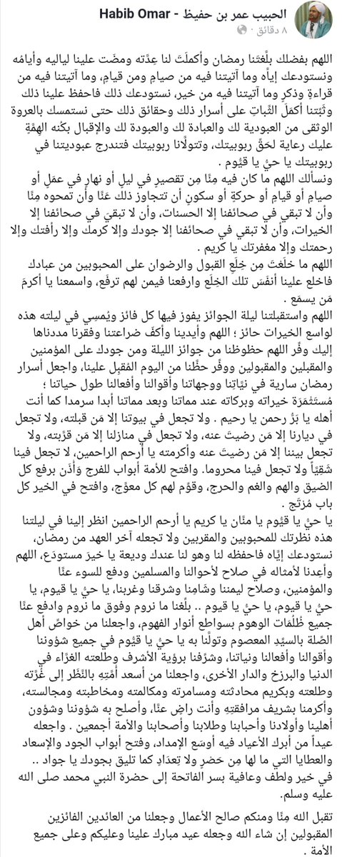 اللهم بفضلك بلغتنا رمضان وأكملت لنا عدّته ومضت علينا لياليه وأيامه ونستودعك إياه وما آتيتنا فيه من صيام ومن قيام، وما آتيتنا فيه من قراءة وذكر وما آتيتنا فيه من خير، نستودعك ذلك فاحفظ علينا ذلك وثبتنا أكمل الثبات على أسرار ذلك وحقائق ذلك ..