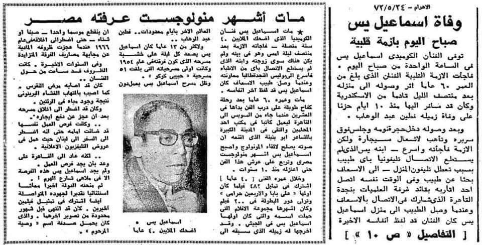 وفاة الأسطورة الضاحك الباكي أبو ضحكة جنان فنان كل العصور خفيف الظل "إسماعيل ياسين" الشهير ب "سمعه"