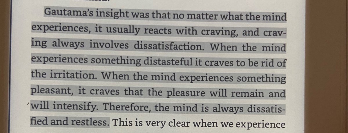 توصل بوذا للنقطة الذي يعتقد انها هي الحل. يقول بغض النظر عن وش العقل جالس يجرب (سعادة، حزن، ألم) هو يكون ردة فعل من الشهوة/اللذة. لما يجرب حاجة جميلة، هو يشتهي يجربها من جديد. فبدل ما يستمتع باللحظة يجلس يترقب المزيد. المزيد هذا هو اللي يخلق عدم الرضا المستمر.
