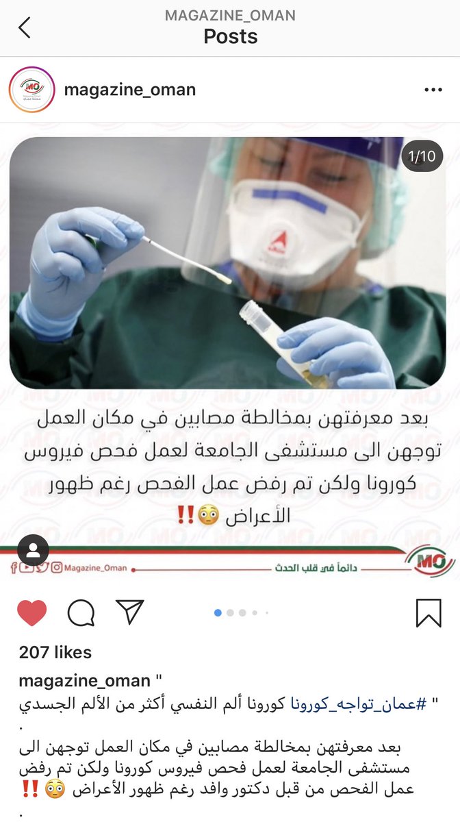 مع هذا بنفس اليوم توجهنا انا وزميلتي فترة المساء الاربعاء بتاريخ ٢٠ مايو ٢٠٢٠ الى مستشفى جامعة السلطان قابوس استقبلونا في مكان التسجيل اخذوا بياناتنا وقالوا نتصل فيكم بعد ما تفضى الغرف لانه عندهم اجراء تعقيم قوي وعميق 4 غرف للفحص وكل غرفه