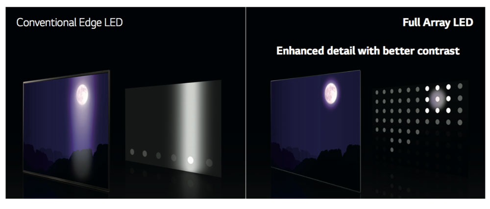 مناطق LED كافية لتغطي كافة التلفزيون وكل كائن معروض على الشاشة لكنها أقل دقة من التعتيم على مستوى البكسل