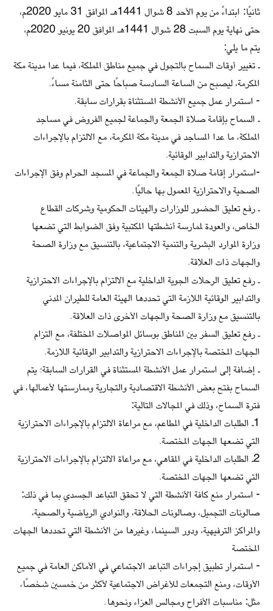 ثانيًا: ابتداءً من يوم الأحد 8 شوال 1441هـ الموافق 31 مايو 2020م، حتى نهاية يوم السبت 28 شوال 1441هـ الموافق 20 يونيو 2020م، يتم ما يلي: