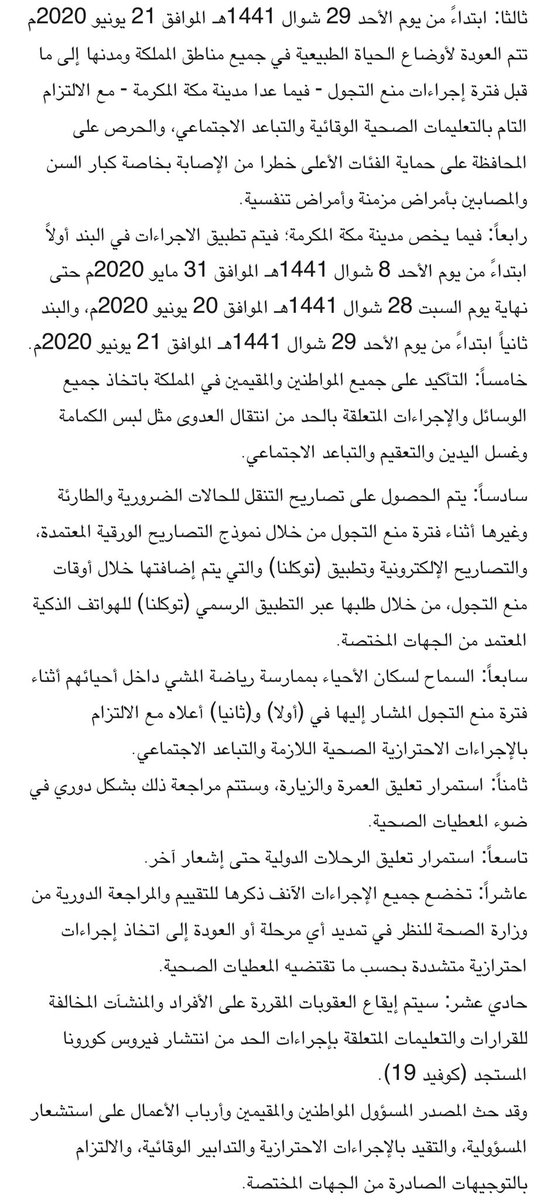 ـ تغيير أوقات السماح بالتجول في جميع مناطق المملكة، فيما عدا مدينة مكة المكرمة، ليصبح من الساعة السادسة صباحًا حتى الثامنة مساءً.…