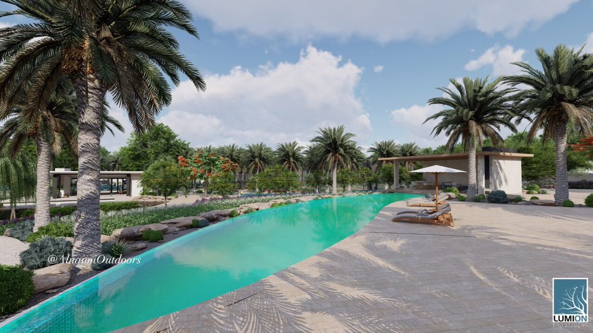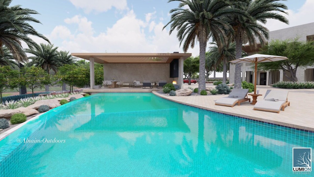 يتشكل المسبح تلقائيا عبر امتدادات خطوط التصميم وتشرف ساحته الكبيرة على البحيرة وبقية المزرعة لاستخدامها في المناسبات بالإضافة لوجود جلسة مسقوفة على جانب المسبح..