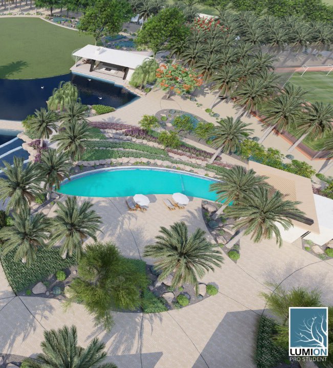 حرصت في التصميم على تحفيز النظر لاكتشاف المنطقة،فهذه المناظر بالأعلى تشجع المستخدم على النزول لممارسة المشي والأحساس بالمكان،ويتيح الممر الدائري للماشي فيه المرور بمناطق مختلفة فيخترق النخيل والبحيرة وتتنوع من حوله المناظر..