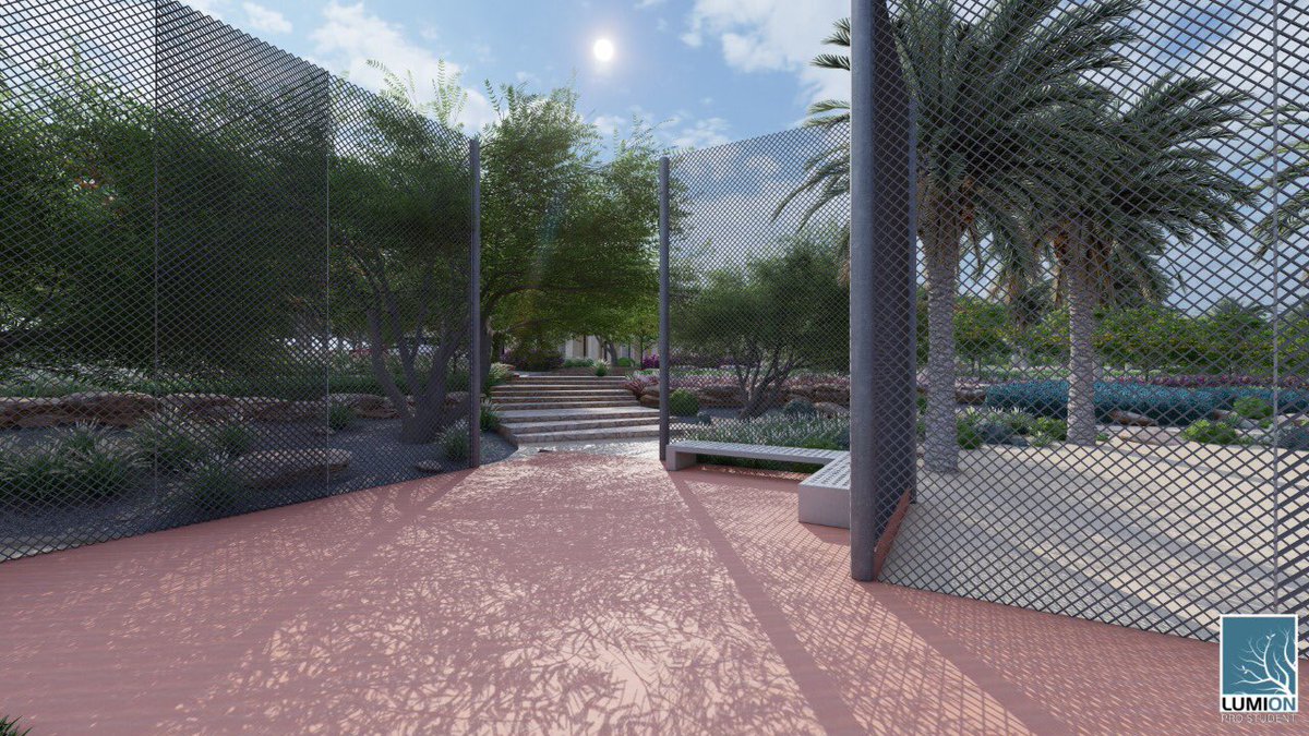 منطقة الملاعب،وتتصل بالفيلا وملحق البحيرة دون التشويش على المنظر العام للموقع،تحيط بها النخيل ولها مدخلان مع منطقتي انتظار في حال التناوب على اللعب.