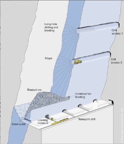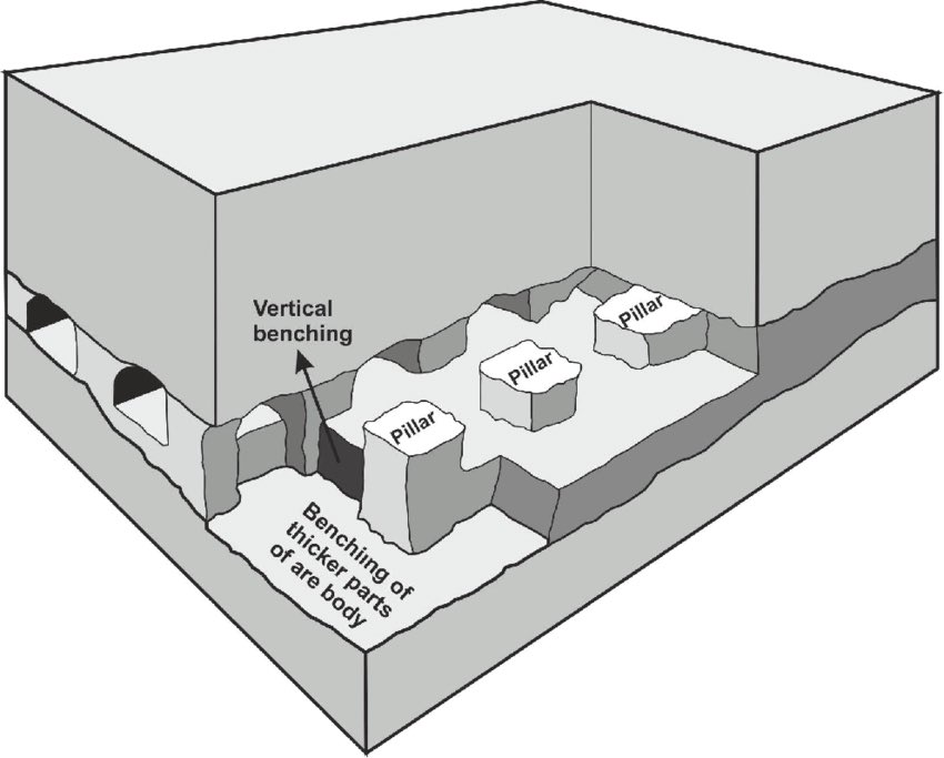 في تقنية التعدين هذه ، يتم حفر سلسلة من الأنفاق الأفقية ، أو المستويات الفرعية ، واحدة فوق الأخرى ، للوصول إلى مستويات مختلفة من الرواسب الخام العمودية. يوجد في الجزء السفلي من الممر نفق للنقل