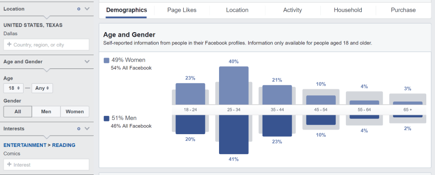 لنفترض انك بتفتح متجر العاب في الرياض , تقدر تحدد الرياض , , وتحت " الإهتمامات " حدد comics , وبعد هذا الاداة بتكشف لك على الفئة العمريه المهتمه مثلا من 19 الى 27 ..