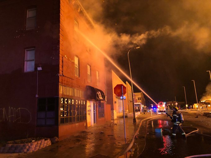 حٌرق مبنى كامل وما كان فيه رجال إطفاء وبدأوا الناس بصب المياه بأنفسهم على أمل اخماد النار ولكن من حسن الحظ وصل رجال الإطفاء متاخرًا بسبب الفوضى