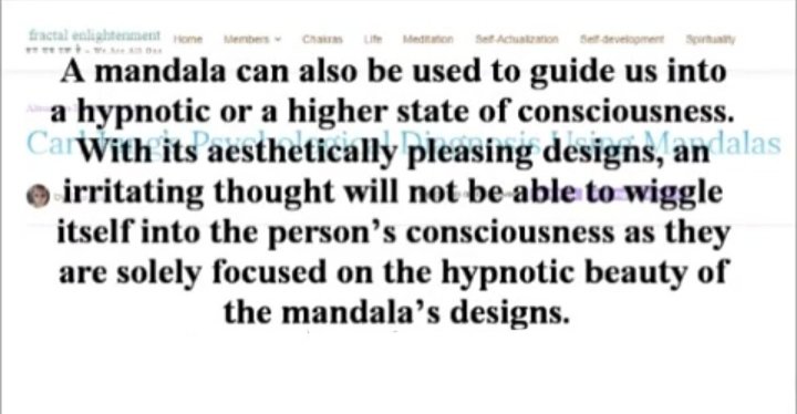 في الحقيقة الماندالا هي أداة للتأمل يتم فيها تعديل مستويات الوعي،لذلك يحس الشخص بالراحة المؤقته الوهميه،و يصبح هو نفسه مركز الماندالا وموضوعه بدل الله فيصبح أسيرا فيها.