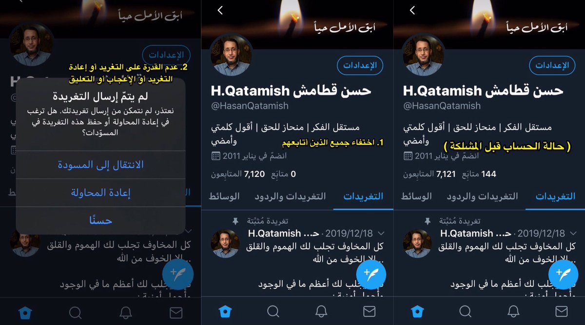 2. منذ أشهر اختفى ( المُتابَعون ) لكن بقي التايم لاين يعرض تغريداتهم ، ثم أعادهم #تويتر بعد بضع ساعات .