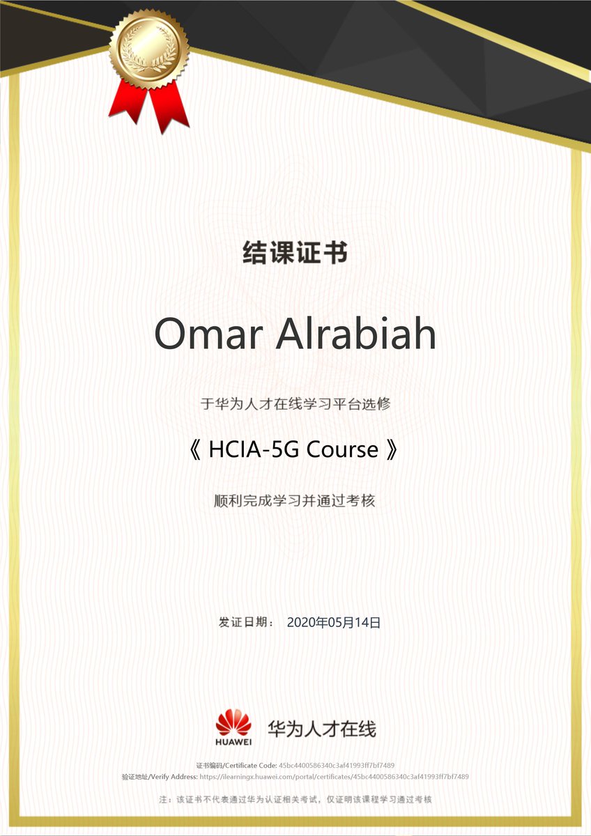 في الصورة أدناه شهادة حضوري عن بعد لدورة عن الجيل الخامس من شركة #هواوي، و هي تُعد إحدى كبار الشركات عالميا و يشار إليها بالبنان في حديثنا التقني و المتوقِّع و الحالم عن #الجيل_الخامس. الدورة على الرابط: