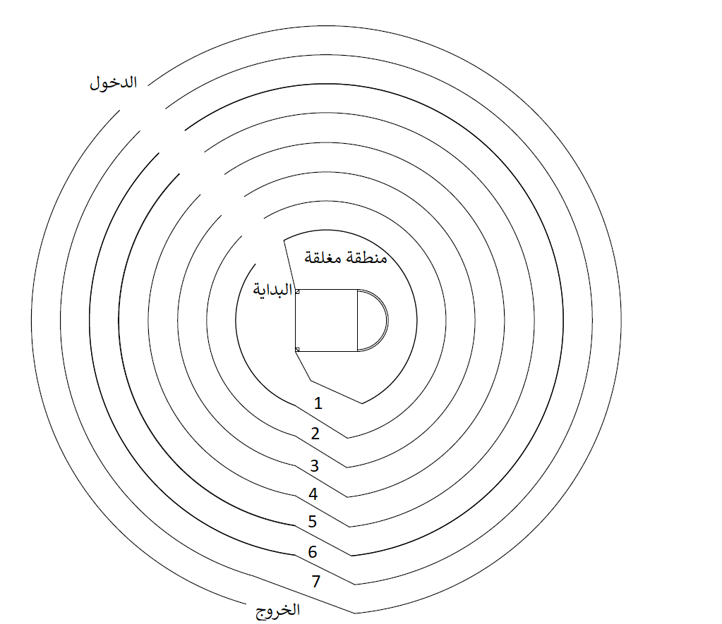 ٣- كل مسار يقسم الى أربعة مسارات أخرى على شكل خطوط يتبعها الطائف بحيث يكون التباعد بينه وبين المجاور له اثنين متر تقريبا ، أي ان المسار الواحد يستوعب أربعة طائفين على خط متوازي.