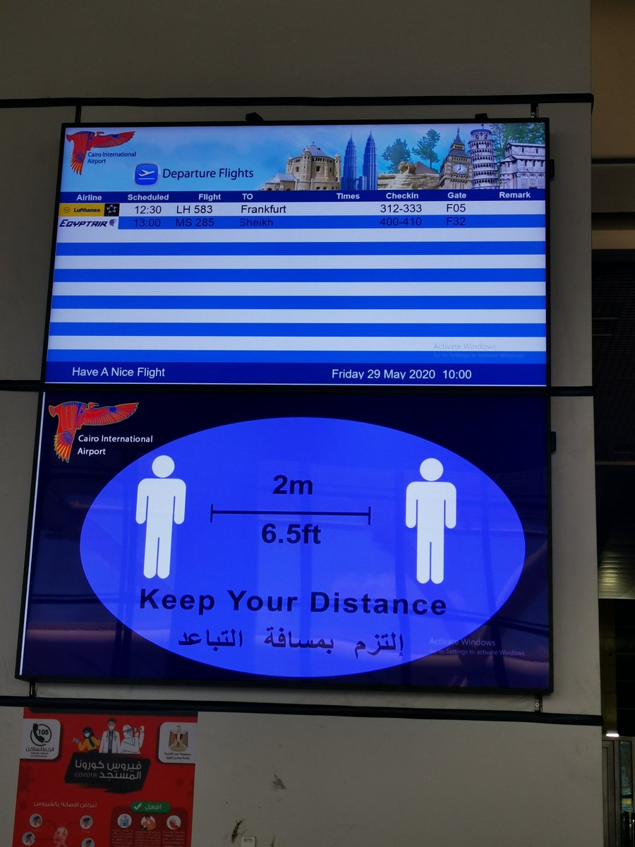 مطار القاهرة مستعد لما بعد الكورونا بارشادات على كل حاجة بالتباعد بالمسافات المطلوبة. الكمامات خلاص جزء من الحياة حتى حين. منظر المطار كان فاضي بشكل مش متعود عليه