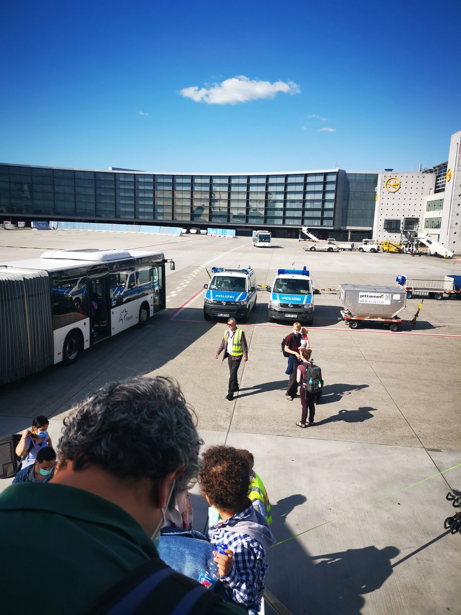 جوه الطيارة وزعوا ارشادات دخول المانيا قبل النزول. لما نزلنا كان في انتظارنا البوليس بيتأكد من كل باسبور واقامة وسبب الزيارة. الاجراءات كانت سلسة وهادئة. ثم اتطلب البقاء في منطقة الترانزيت لأي حد مكمل مكان تاني.