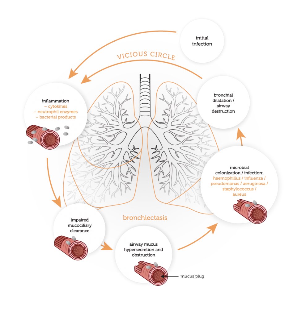 في هذه الحالة تفقد المسالك الهوائية ببطء قدرتها على إزالة المخاط و عندما لا يمكن إزالة المخاط ، فإنه يتراكم ويخلق بيئة يمكن أن تنمو فيها البكتيريا، و هذا يؤدي إلى عدوى رئوية متكررة وخطيرة.