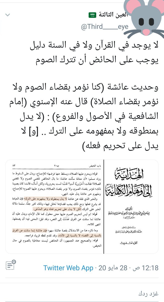 ٣- استدل الدكتور @Third_____eye بهذا النقل عن الإسنوي الشافعي في ما ذهب إليه، والذي يبدو من النقل والتعليق أن الإسنوي يرى وجوب الصوم على الحائض في رمضان !
