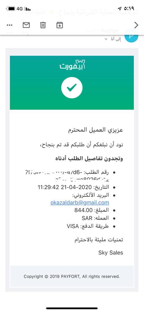 6- أرسلت ايميل في 5 / 5 / 2020 ، على ايميل المتجر الرسمي ، اشكو من تاخر الطلبية وانها مازالت في المخزن ، وجاء الرد من المبيعات الجوية @skysalesonline آلياً مباشرة بأننا نعمل جاهدين لشحن طلبك .