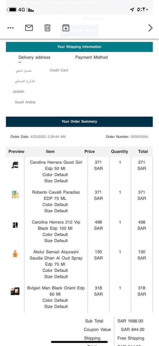 3- توكلت على الله وأخذت مجموعة عطور بتكلفة 844 ريال في 22 / 4 / 2020 ، وكان أكبر خطأ ارتكبته الدفع مباشرة عبر الفيزا ، كنت اتوقع ان الأولية لمن يدفع . وكنت اتوقع ان متجر المبيعات السعودية @skysalesonline متجر محترم وأمين على أموال العملاء.