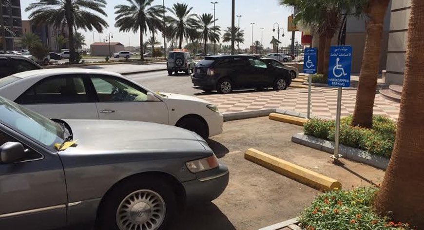 عزيزي مصمم المواقف .. تصميم المواقف لذوي الاحتياجات الخاصة يجب ان يراعي أن المستخدم قد يكون قائد المركبة او أحد الركاب ممن يستخدمون الكرسي المتحرك ويجب ان تراعي المسافة الفارغة للسماح باستخدام الكرسي بين السيارات (شاهد صورة ٣) والا فإن الموقف عديم الفائدة
